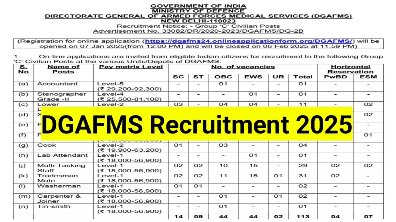 DGAFMS Recruitment 2025: Directorate General of Armed Forces Medical Services (DGAFMS) is hiring for MTS, LDC, Tradesman Mate, Washerman, Carpenter Other Posts. Candidates with 10th/12th/ITI/ B.Com/Diploma qualifications can apply for this position. A total of 113 posts will be recruited through this vacancy. The job location of all the selected candidates in this recruitment will be in PAN India. All eligible & interested candidates can apply online on or before 06th February 2025. The detail educational qualification and vacancies for DGAFMS jobs are explained below.