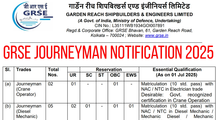 GRSE Recruitment 2025 | Journeyman | 52 Posts | ITI Pass | Last Date : 4th August 2025 |