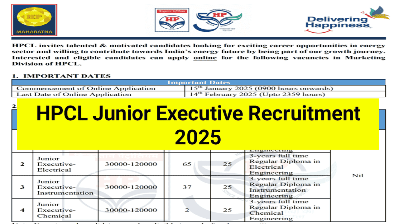 HPCL Junior Executive Recruitment 2025: Hindustan Petroleum Corporation Limited (HPCL) is hiring for Junior Executive Officer (JEO) roles. Candidates with Diploma qualification can apply for this position. There are 234 openings available for these posts. The job location of all the selected candidates in this recruitment will be in PAN India. All eligible & interested candidates can apply online on or before 14th February 2025. The detail educational qualification and vacancies for HPCL jobs are explained below.