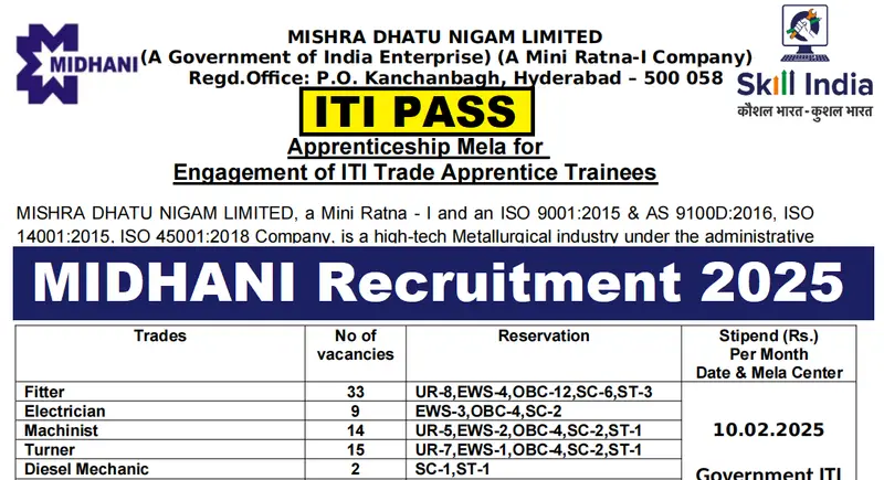 MIDHANI Walk In Interview 2025 | Freshers | Apprentice Trainees | 120 Posts | ITI Pass | February 2025 |